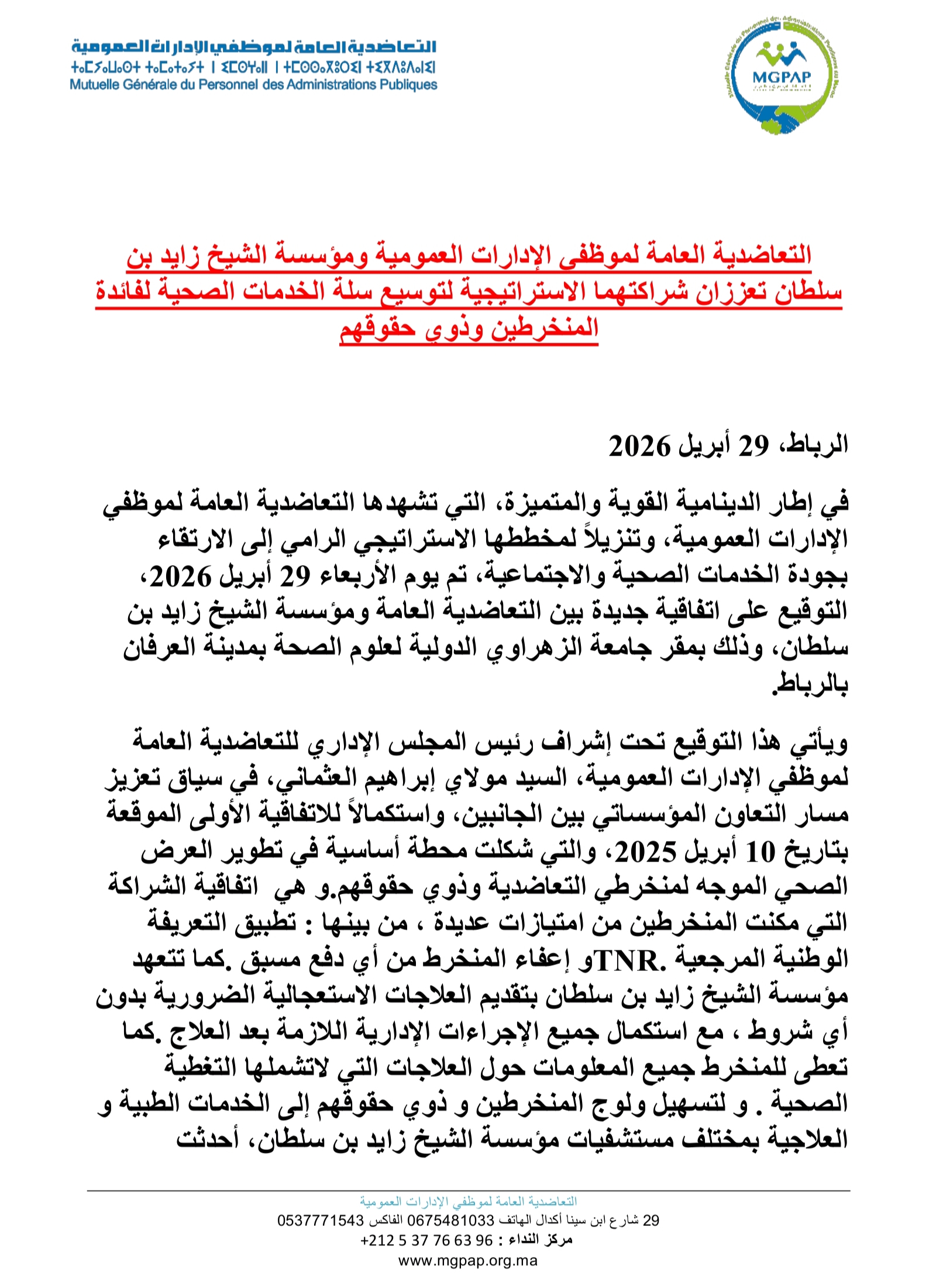 في خطوة تُعد سابقة من نوعها وتعكس روح المسؤولية الاجتماعية، أقدمت التعاضدية العامة لموظفي الإدارات العمومية بشراكة مع مؤسسة الشيخ زايد بن سلطان على توقيع اتفاقية يوم الأربعاء 29 أبريل 2026، تروم تمكين كافة المنخرطين من الاستفادة من خدمات التحاليل الطبية والفحوصات الإشعاعية (الراديو) بشكل مجاني.