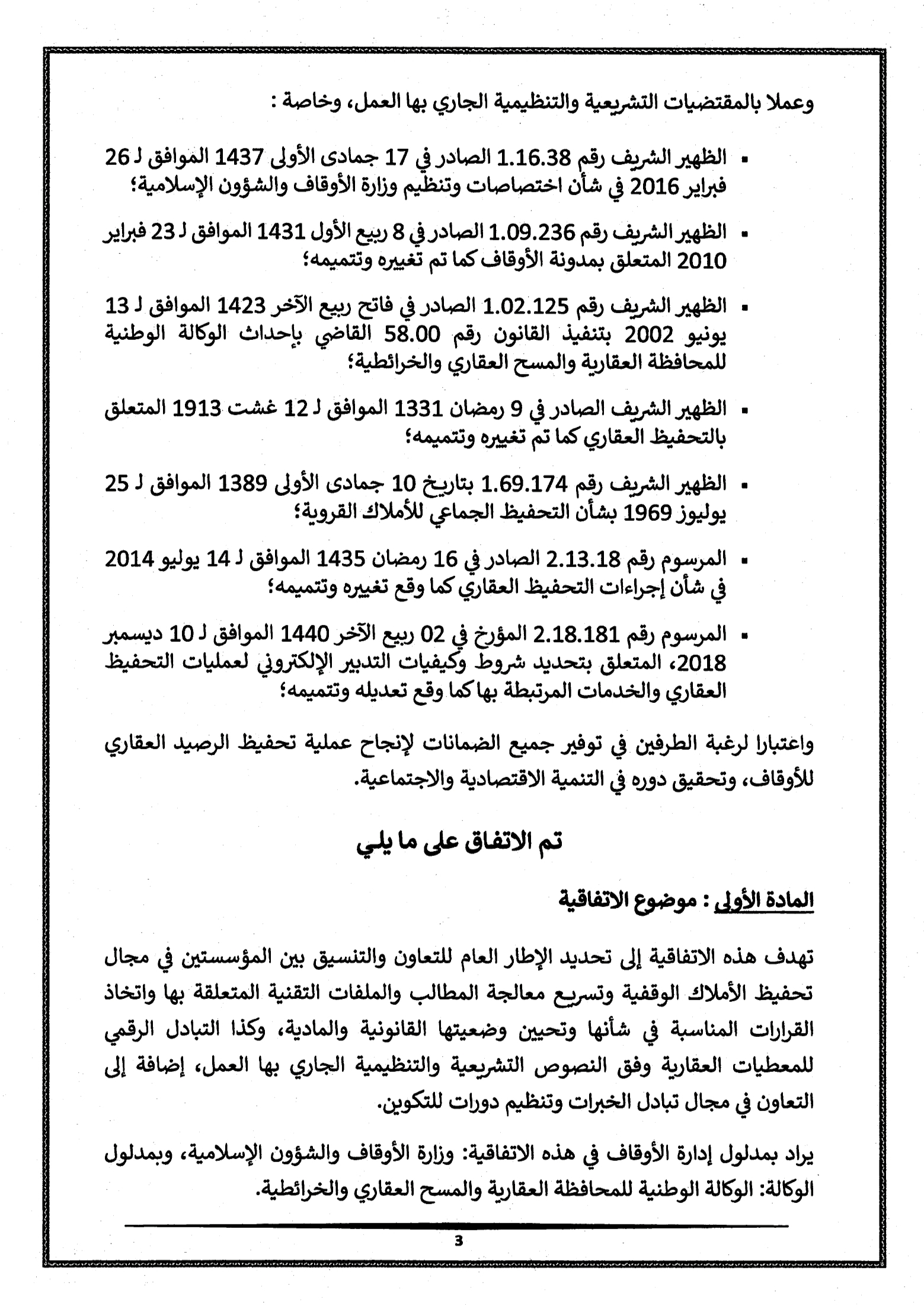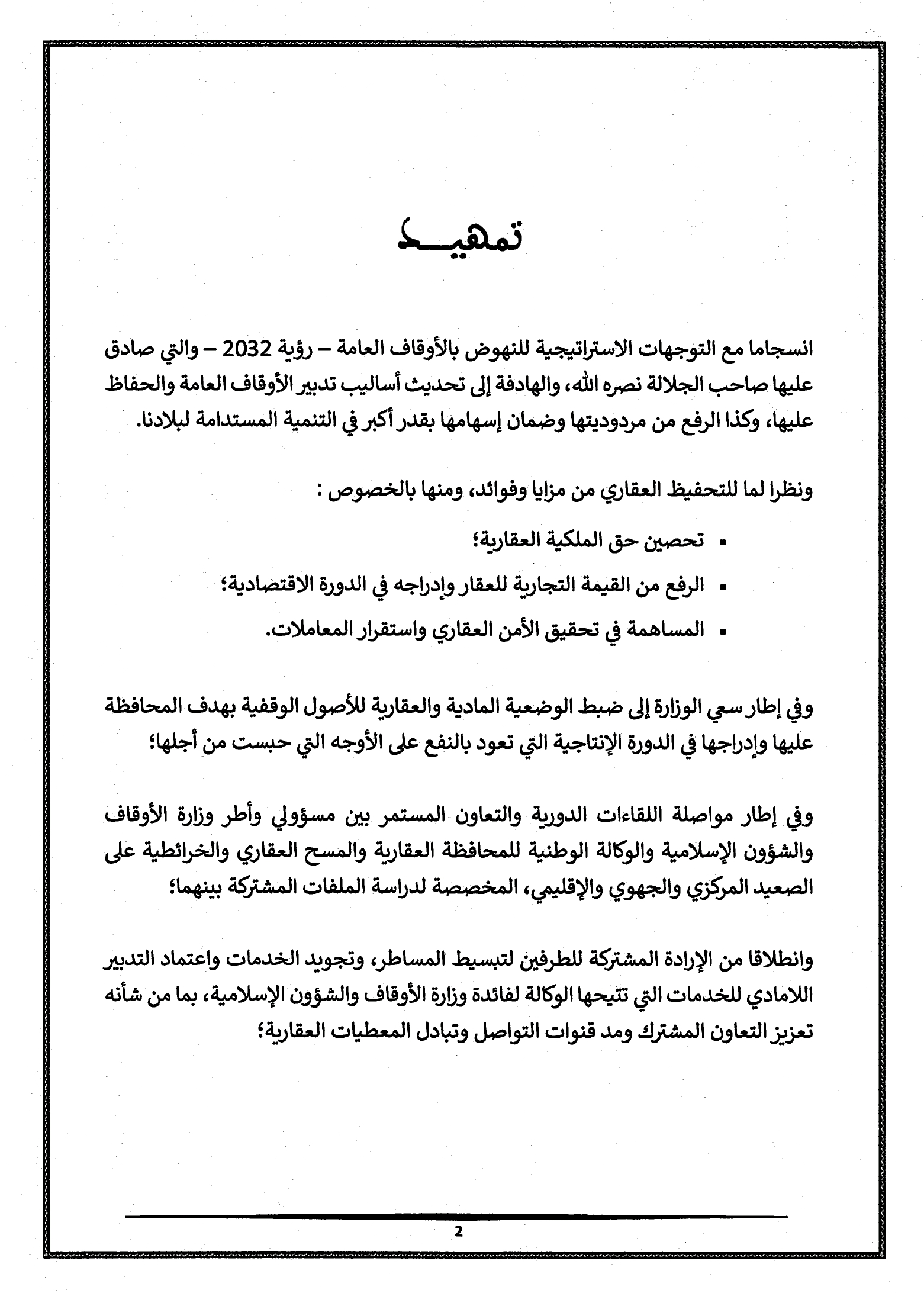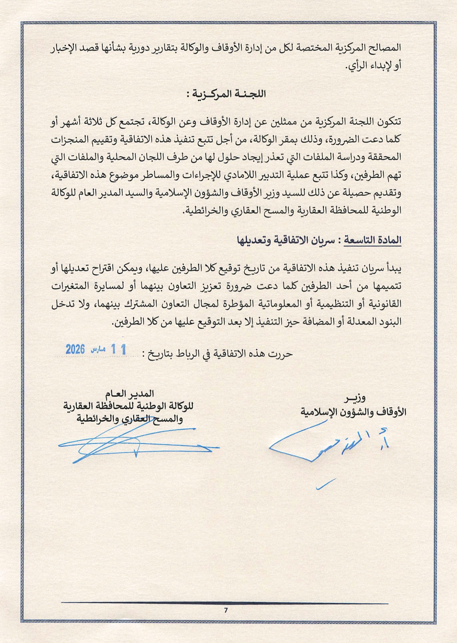 إن اتفاقية الشراكة الموقعة في 11 مارس 2026 تمثل خطوة مهمة نحو إعادة هيكلة تدبير العقار الوقفي بالمغرب وتعزيز أمنه القانوني، كما تعكس وعياً متزايداً بأهمية الأوقاف كرافعة للتنمية.