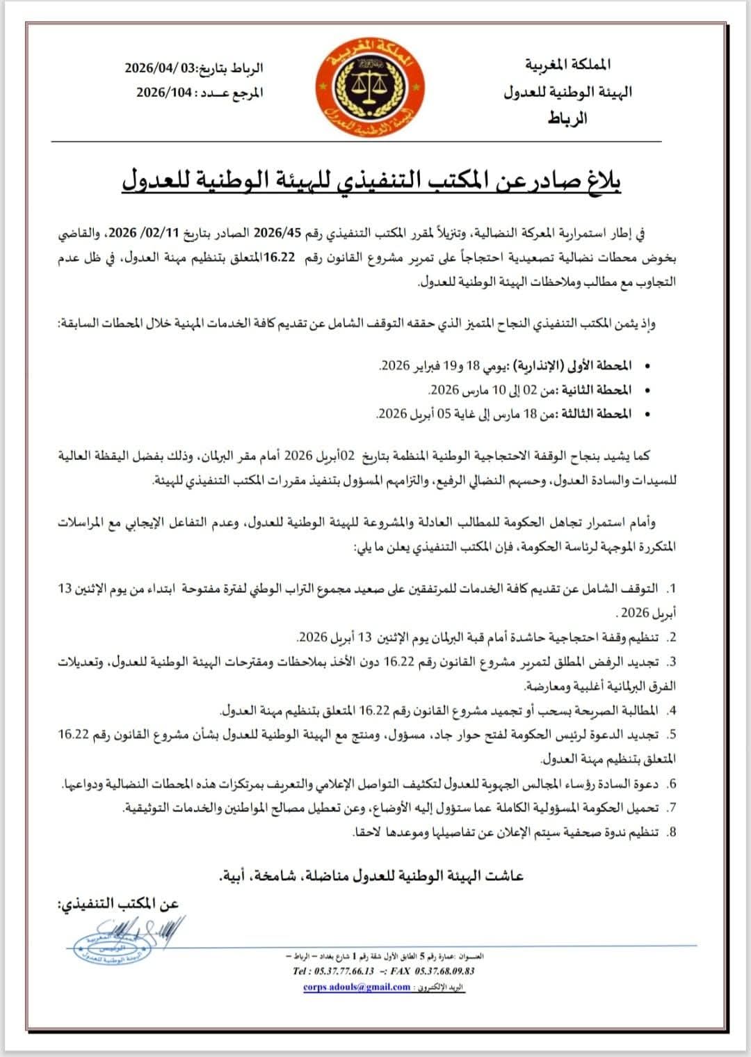 وبحسب بلاغ توصلت به الجريدة، فإن المكتب التنفيذي للهيئة قرر خوض برنامج نضالي تصعيدي، يتقدمه توقف شامل عن تقديم كافة الخدمات التوثيقية على الصعيد الوطني ابتداء من يوم الاثنين 12 أبريل 2026، ولمدة مفتوحة، في خطوة من شأنها أن تشل جزءا مهما من المعاملات اليومية المرتبطة بالعقار والتوثيق والزواج والإرث وغيرها من الخدمات الحيوية.